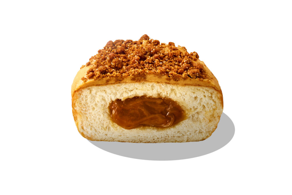 A caramel filled donut with a coating of caramel ganache and crunchy caramel crumbles.