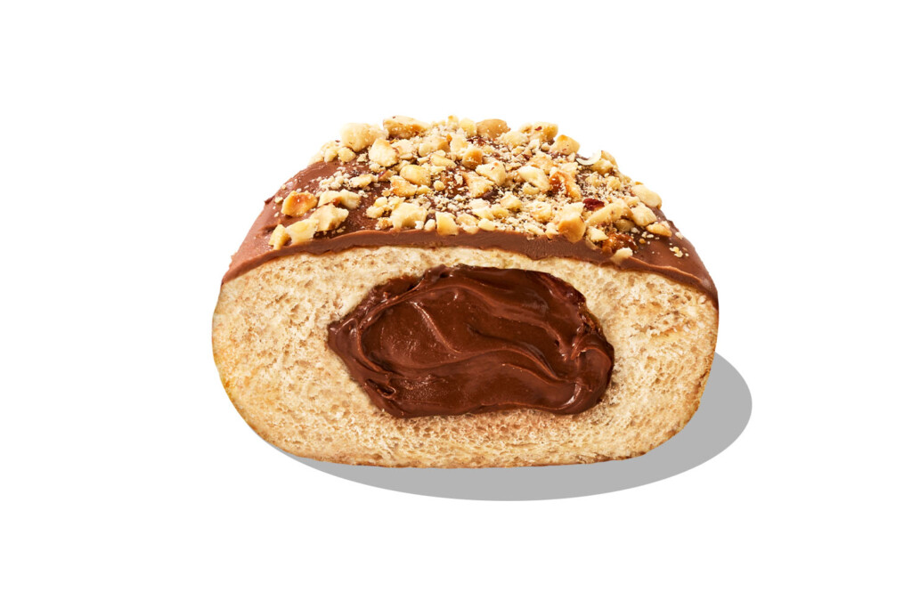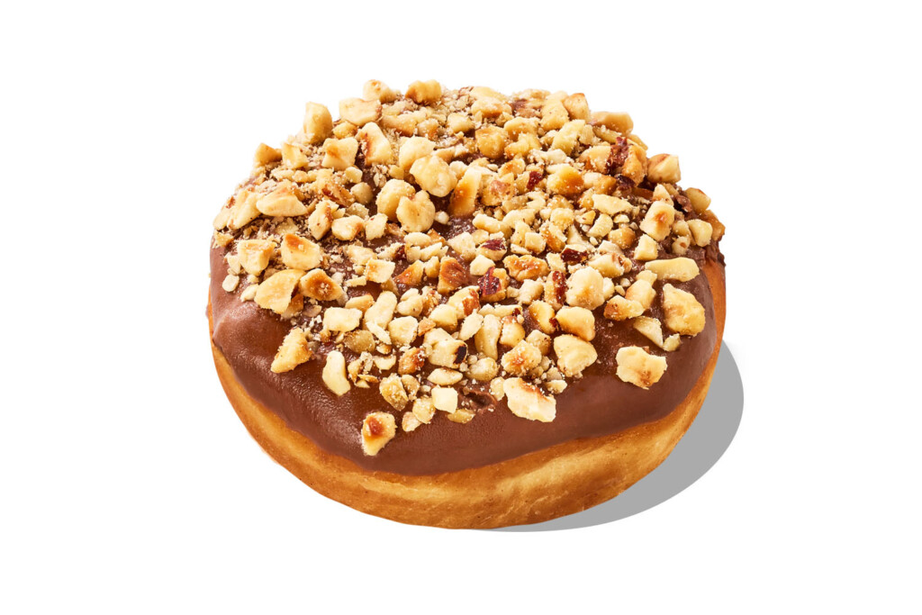 A chocolate hazelnut filled donut with a chocolate coating topped with roasted hazelnut pieces.