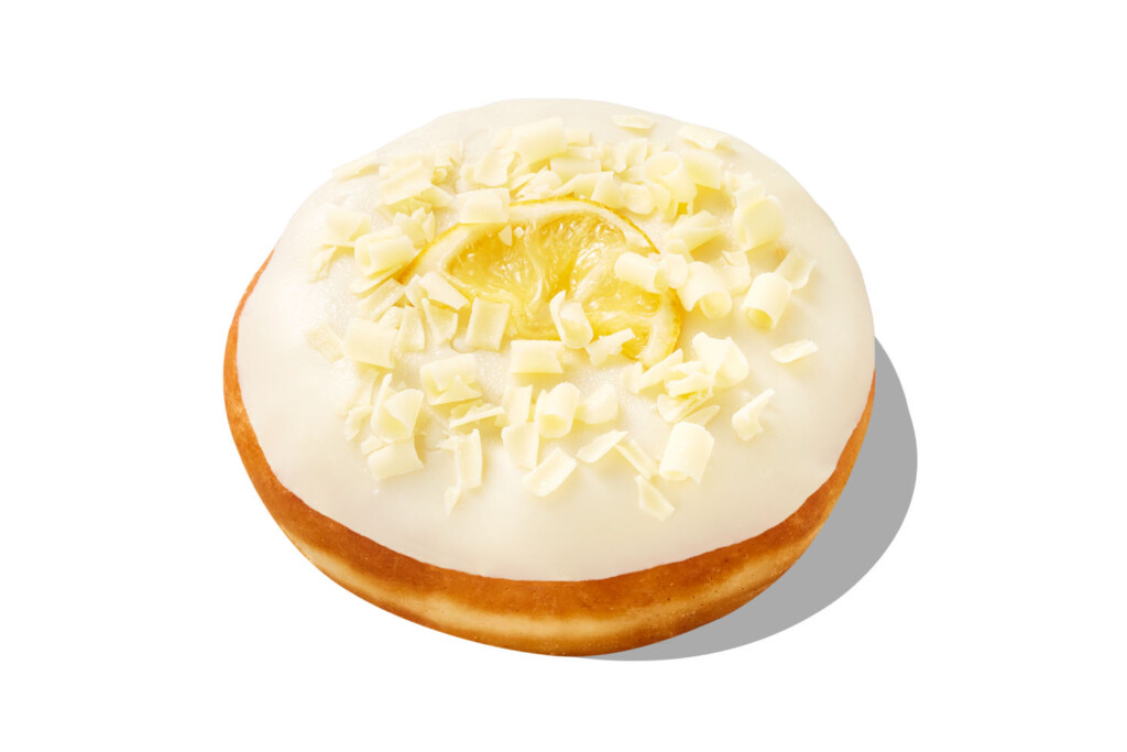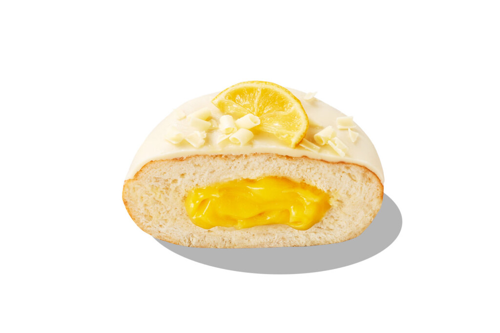 A lemon curd filled donut with white chocolate icing and curls topped with a lemon slice.