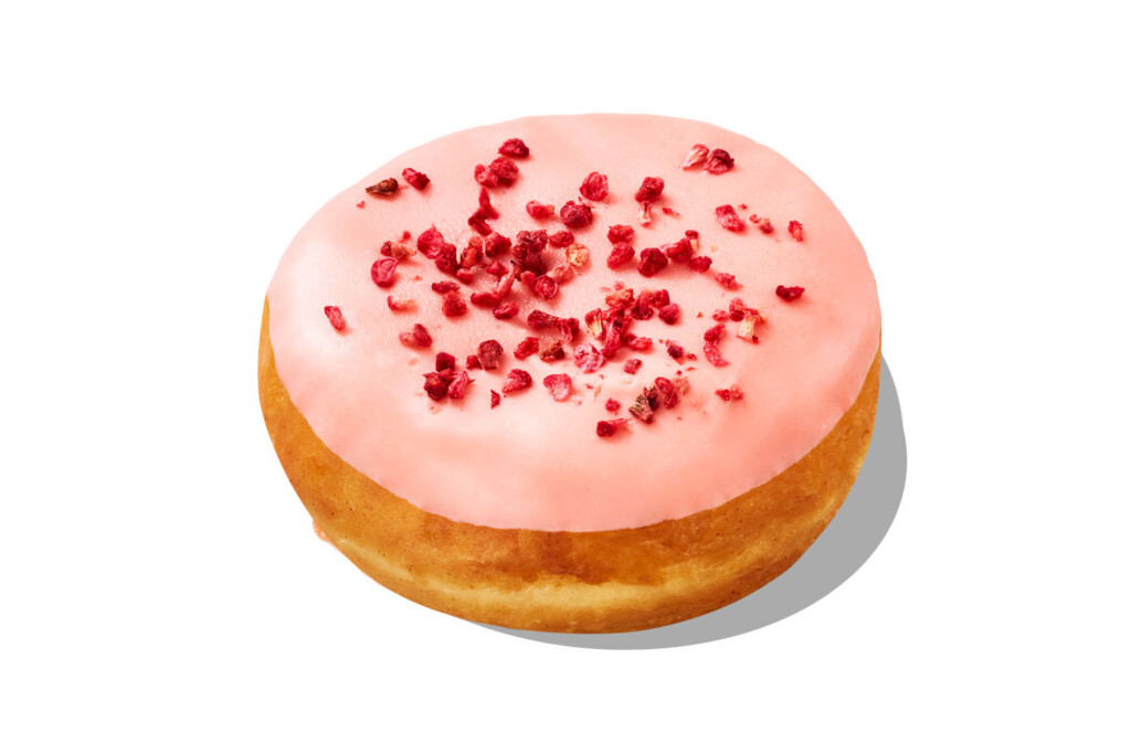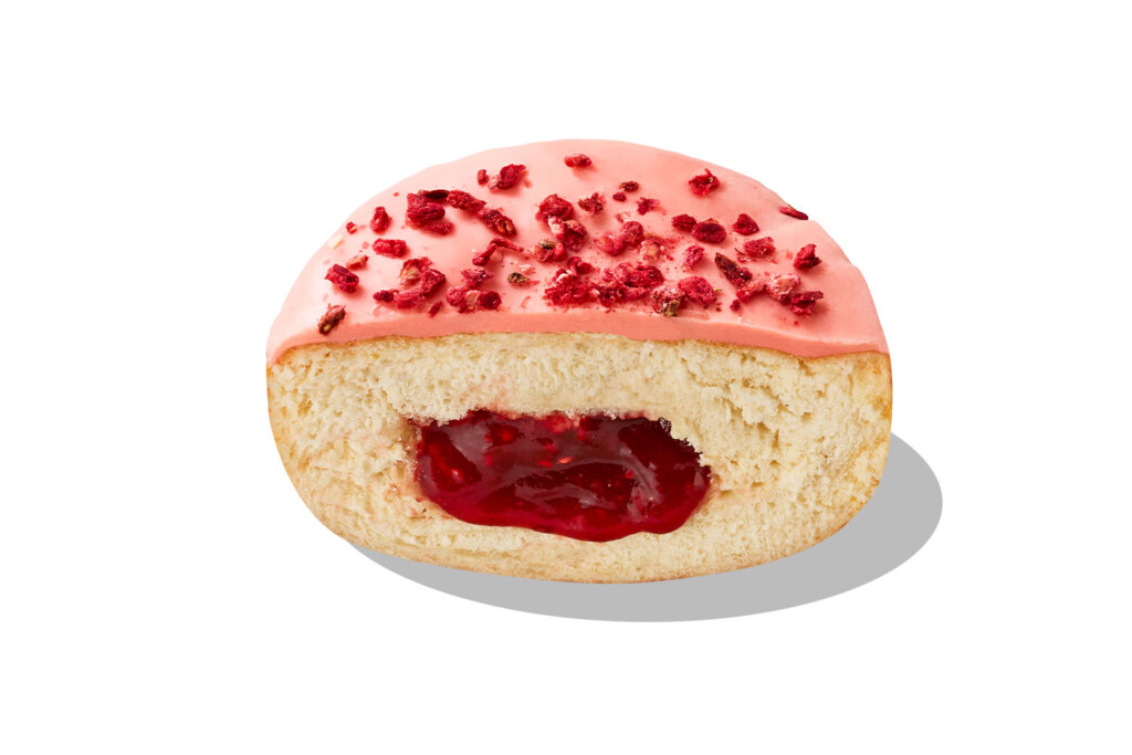 A raspberry jam filled donut with pink coloured white chocolate icing and freeze-dried raspberry pieces.