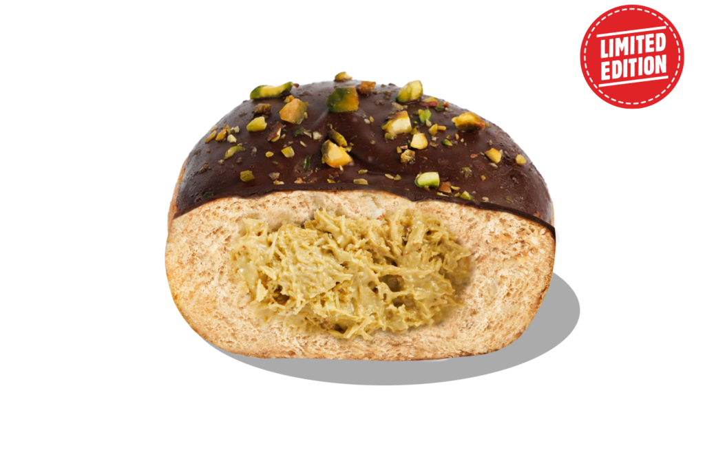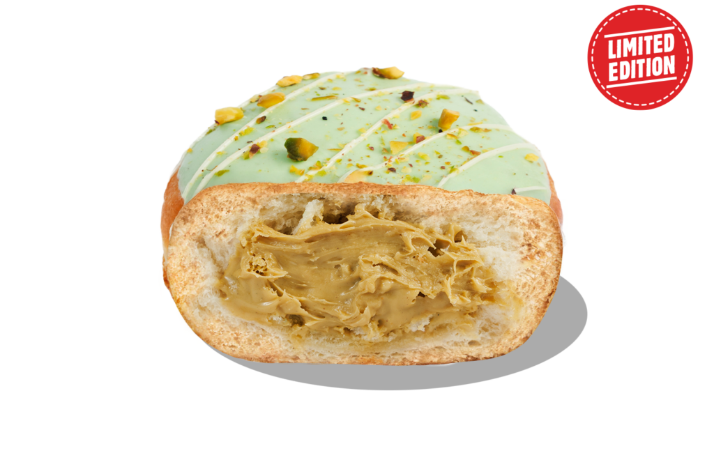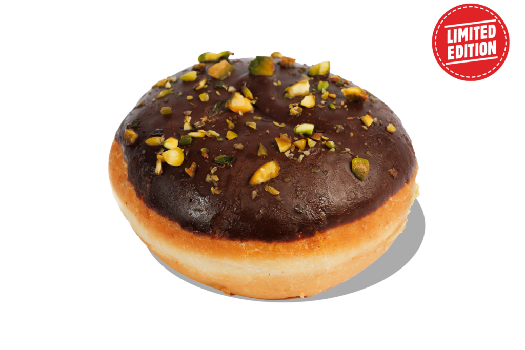 The famous "Dubai Chocolate" donut: pistachio-kunafa crunch, dark chocolate coating, and crushed pistachios.