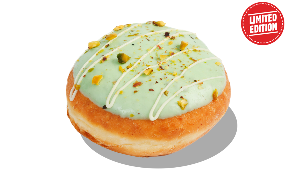 A pistachio cream-filled donut with a white chocolate coating topped with crushed roasted pistachios.