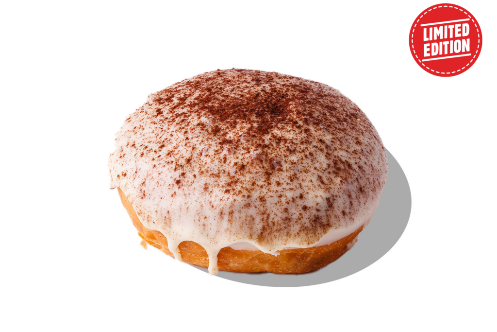 Our new Tiramisu donut is a coffee cream filled donut, icing and a light dusting of cocoa on top.